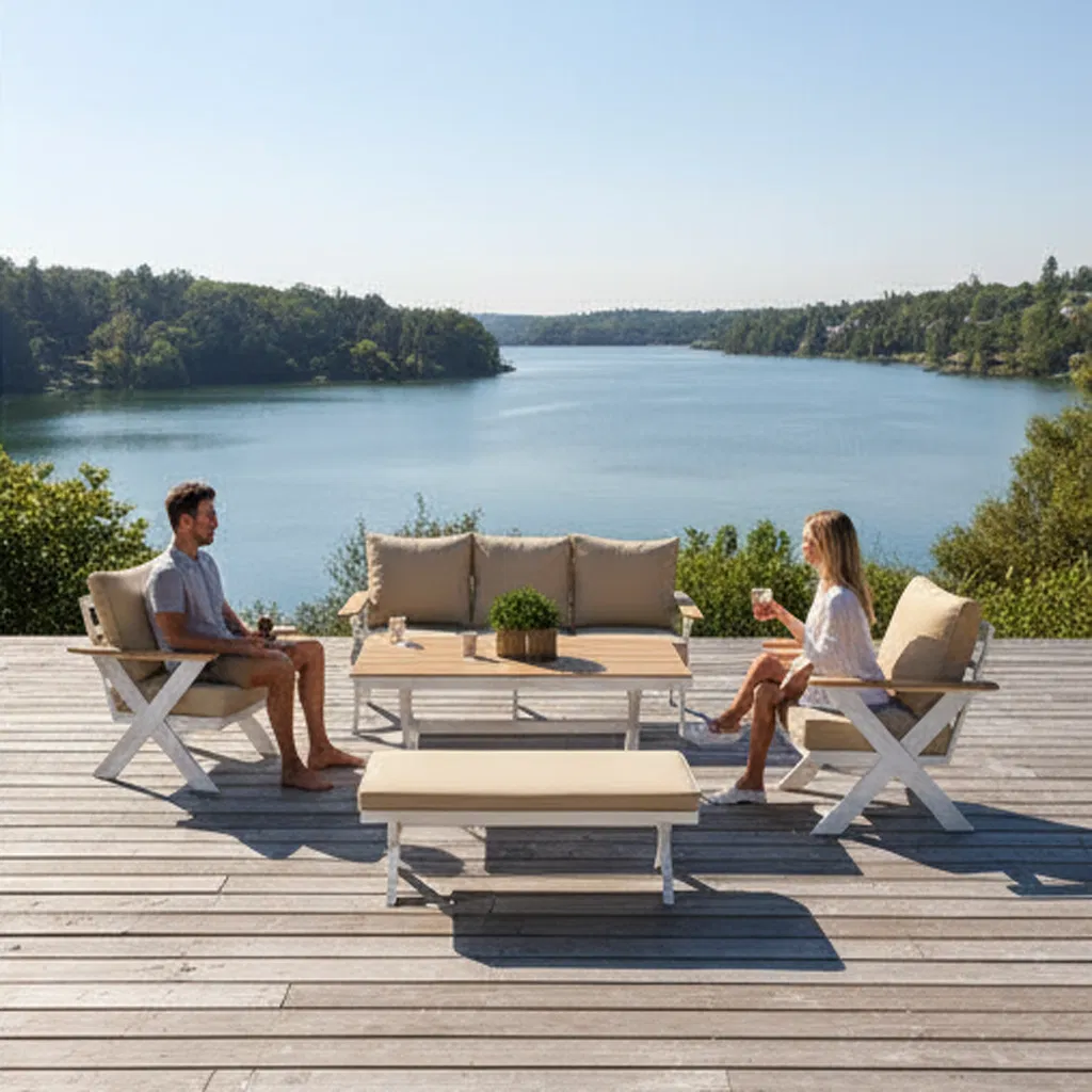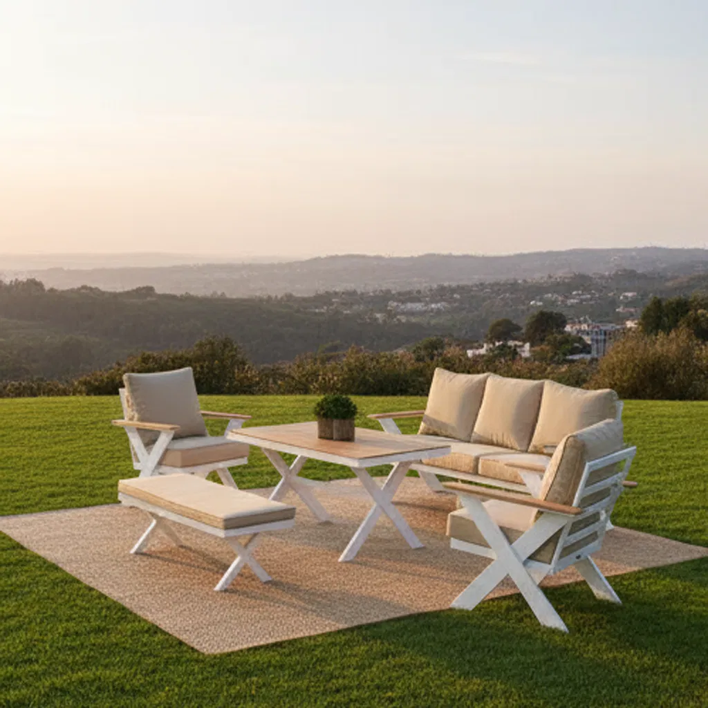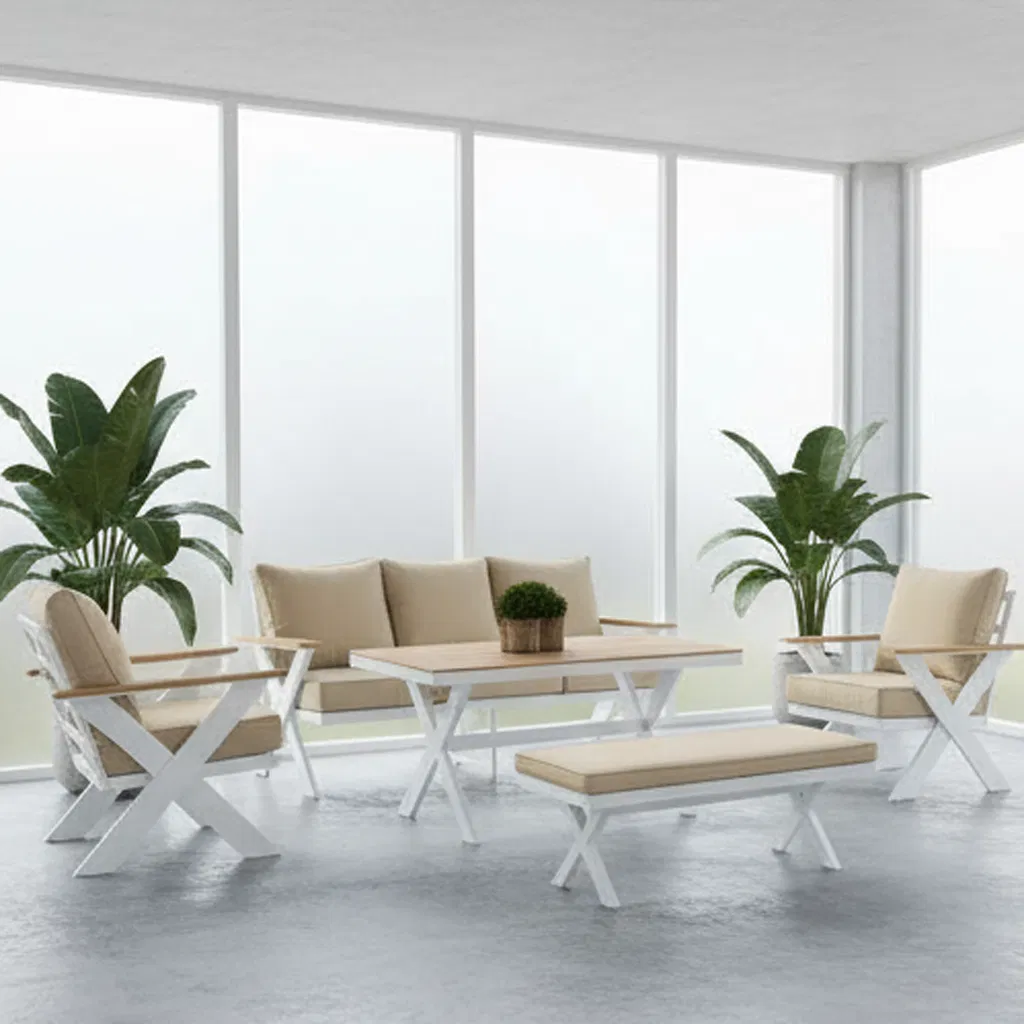 1 set =1pc three seats chair +2pcs single seat chair +1pc "X" table +1pc long chair Frame :powder coating screw :304 stainless steel